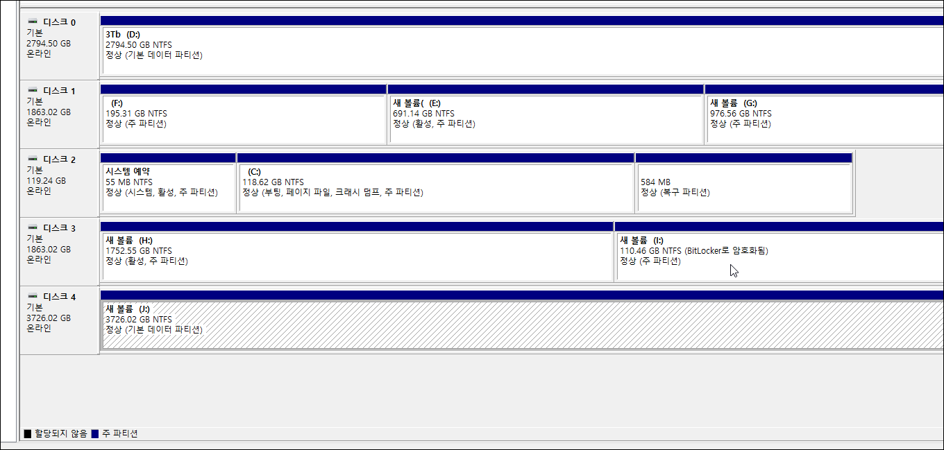 그리고 새로 생긴 H 드라이브의 남아 있는 용량을 위의 마우스가 가리키는 것과 같이 다시 볼륨을 만들어서 I 드라이브로 만들었고요, 이 드라이브를 윈도우 BitLocker 기능으로 암호화 하여 이곳에 비밀 파일들을 넣어두려고 합니다.