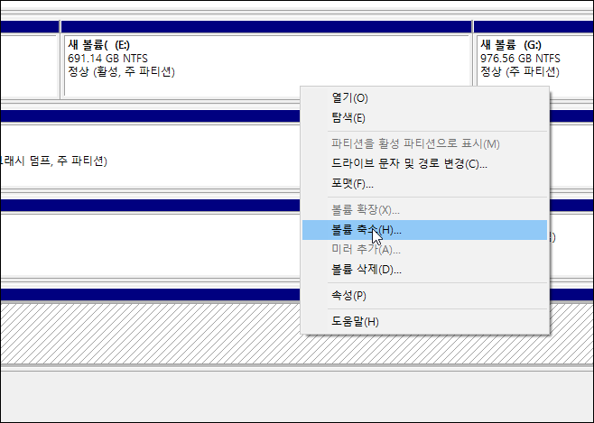 위와 같이 원하는 드라이브를 선택하고 마우스 우클릭하여 [볼륨 축소]를 클릭합니다.