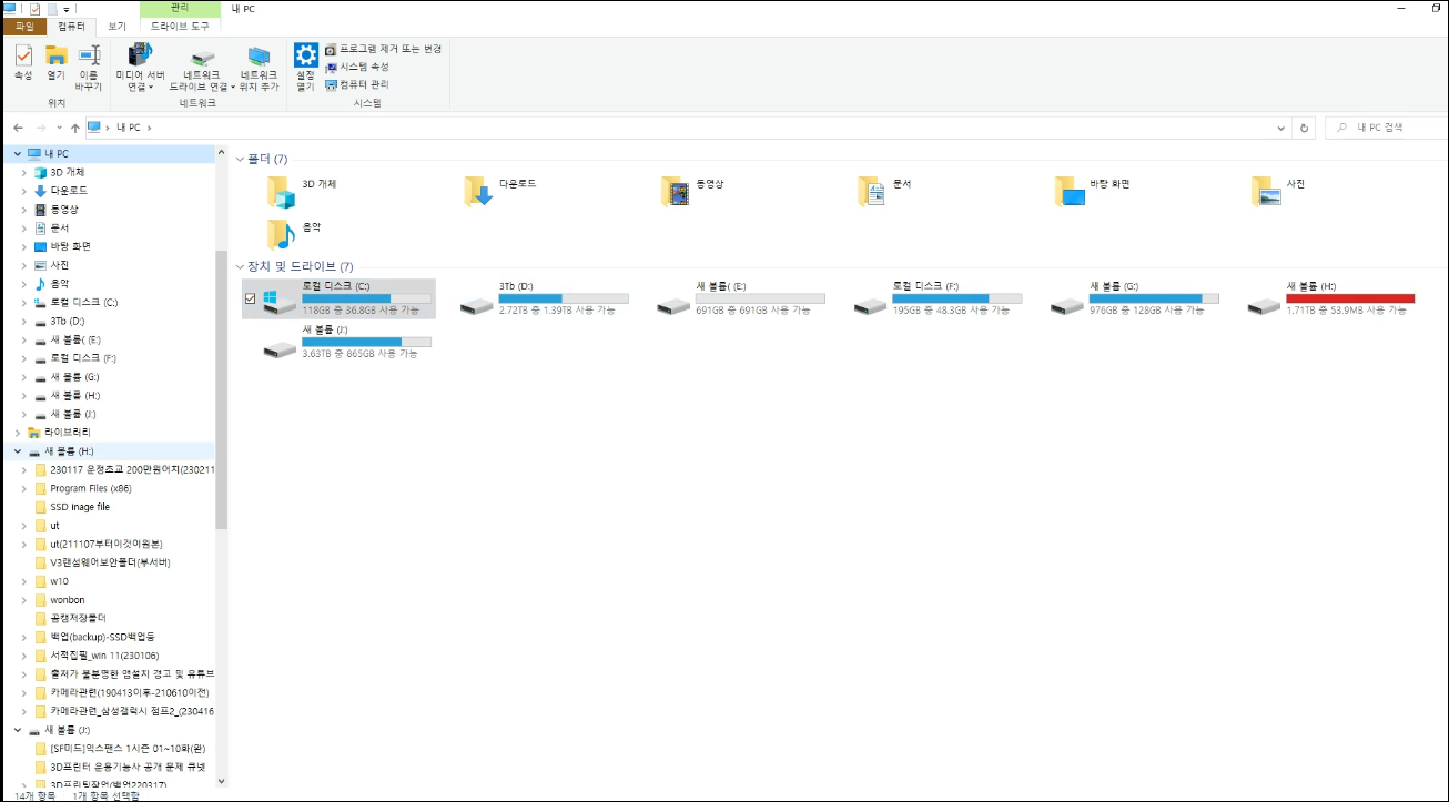 위에 보이는 것이 보통 C, D.. 등으로 불리는 드라이브이고요, 필자는 직업의 특성상 드라이브가 아주 많고요, 이 중에서 위의 빨간 표시가 되어 있는 H 드라이브를 활용하여 암호화 드라이브를 만들려고 합니다.